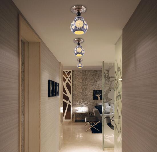 中式风格的陶瓷吸顶灯高雅精巧,青花瓷的灯罩在温暖的灯火下,营造出几分幽幽雅韵。陶瓷外表质感十足,光泽亮丽,雕花精巧,不只照亮了走廊空间,还为家增添了一道独有的中式古典神韵,成为家居一大亮点。